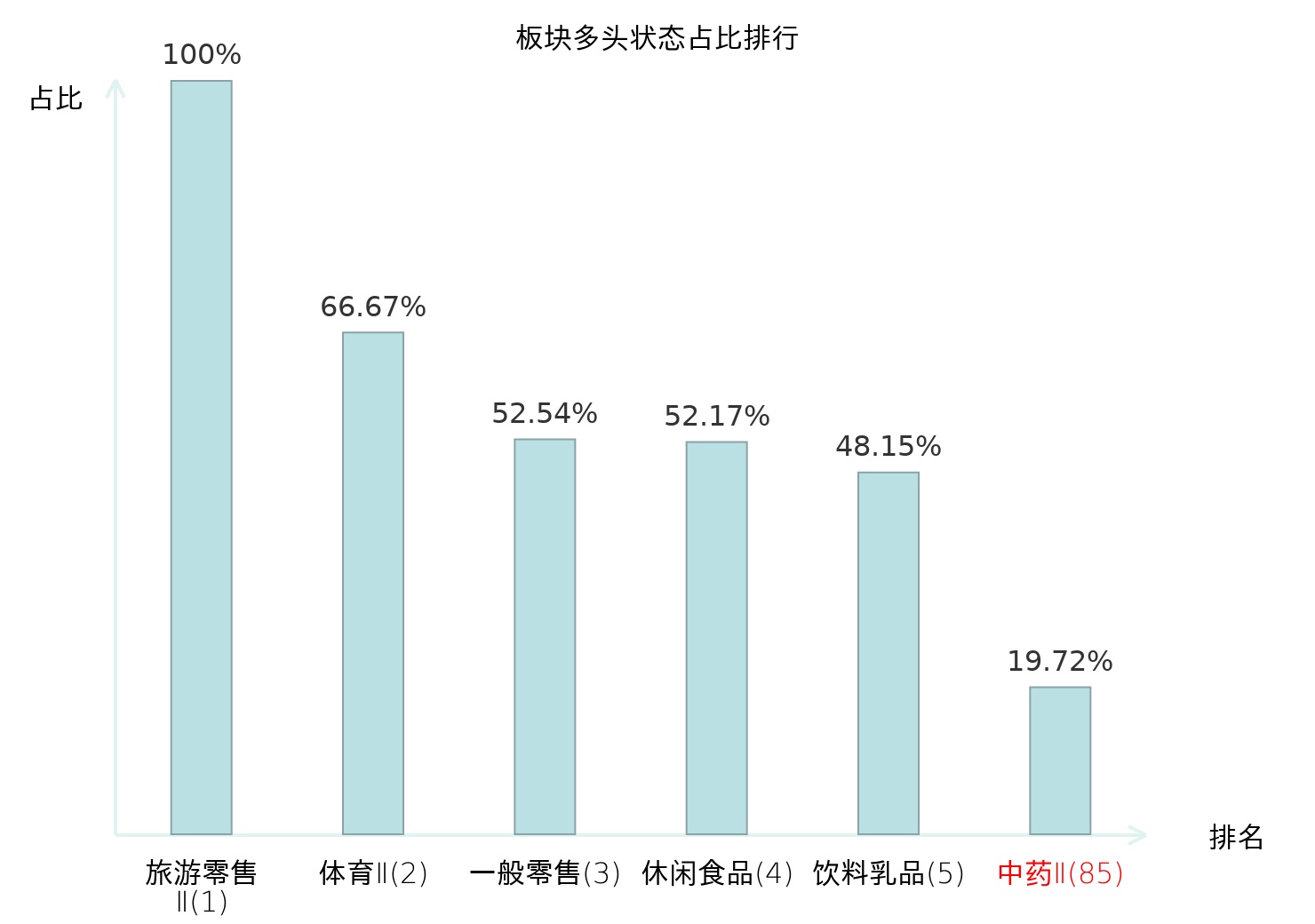 全市场所有行业板块中主力多头状态占比排名中,旅游零售Ⅱ板块位居第一。农业综合Ⅱ板块名次提升最快,较昨日上升109位。