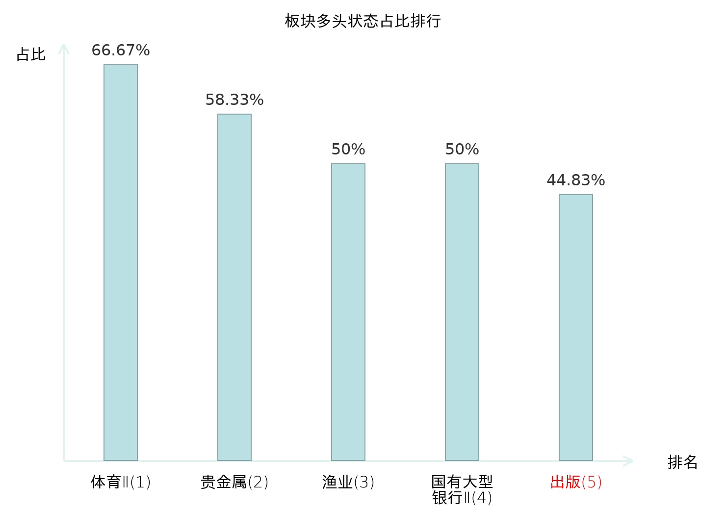 全市场所有行业板块中主力多头状态占比排名中,体育Ⅱ板块位居第一。农业综合Ⅱ板块名次提升最快,较昨日上升113位。