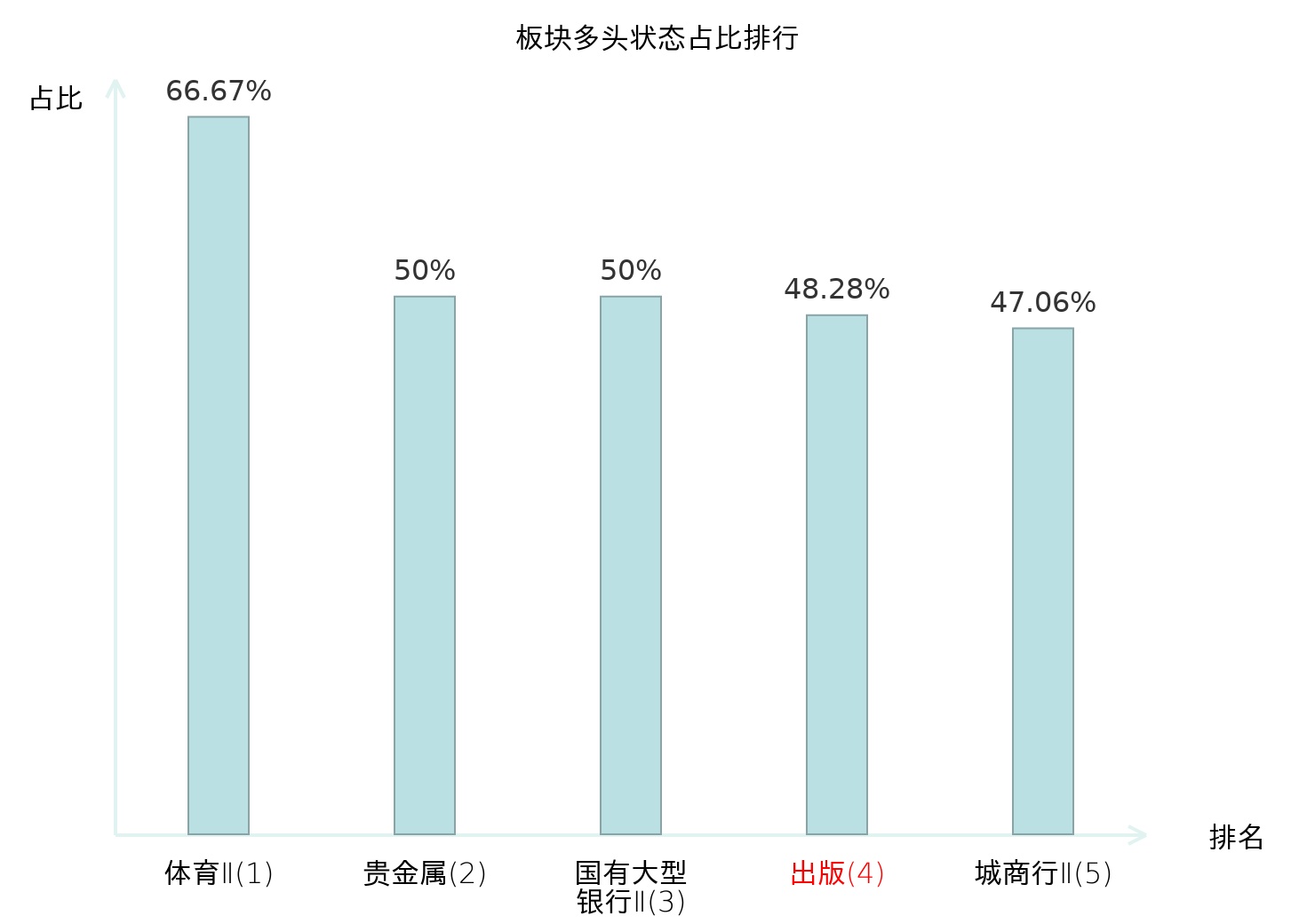 全市场所有行业板块中主力多头状态占比排名中,体育Ⅱ板块位居第一。电子化学品Ⅱ板块名次提升最快,较昨日上升78位。