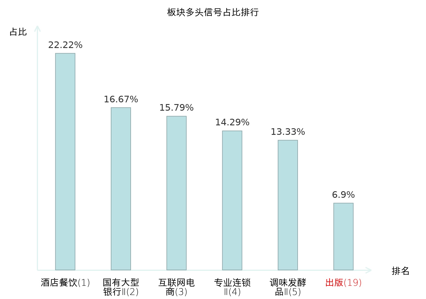 全市场所有行业板块中主力多头信号占比排名中,酒店餐饮板块位居第一。国有大型银行Ⅱ板块名次提升最快,较昨日上升121位。
