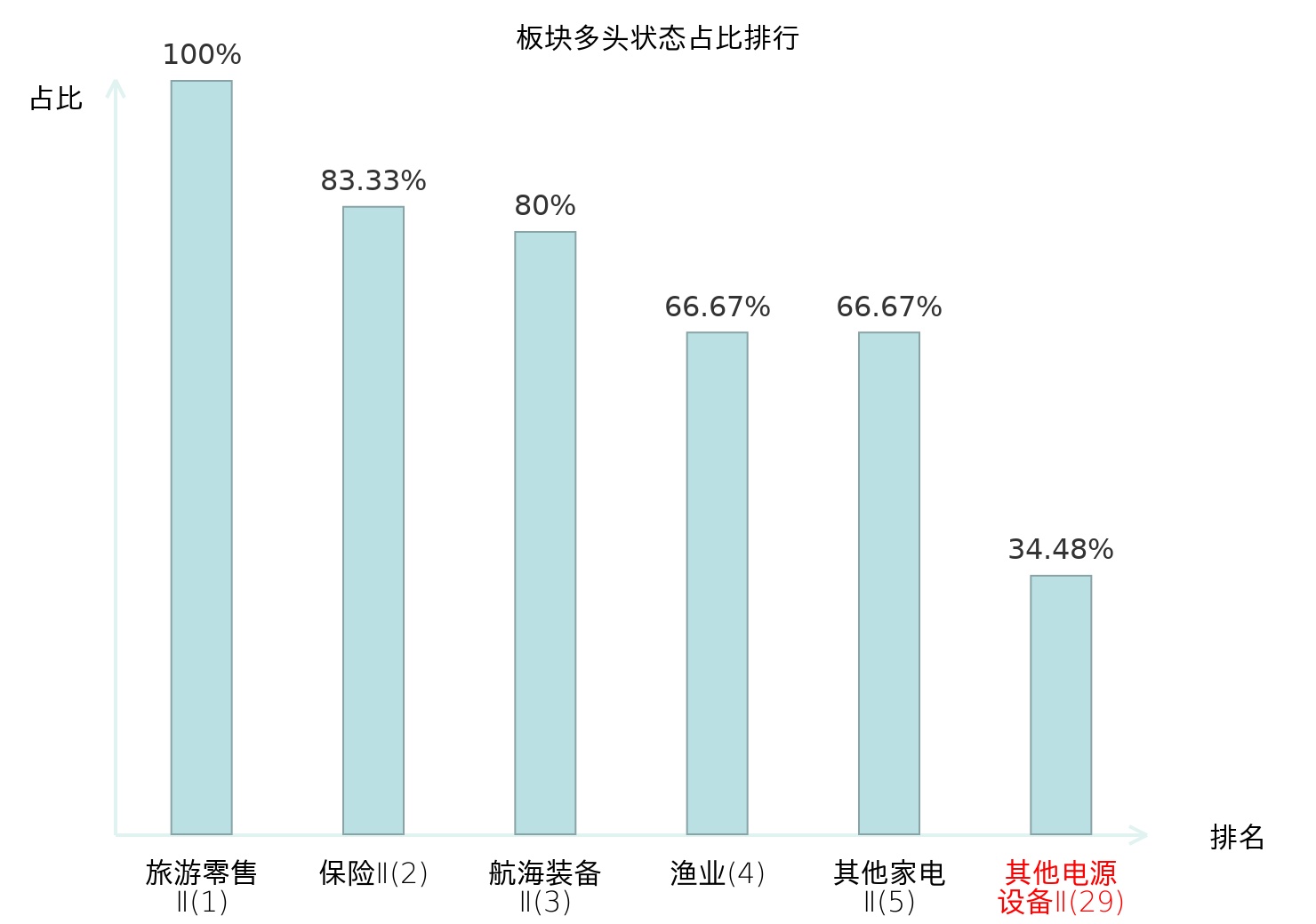 全市场所有行业板块中主力多头状态占比排名中,旅游零售Ⅱ板块位居第一。证券Ⅱ板块名次提升最快,较昨日上升106位。