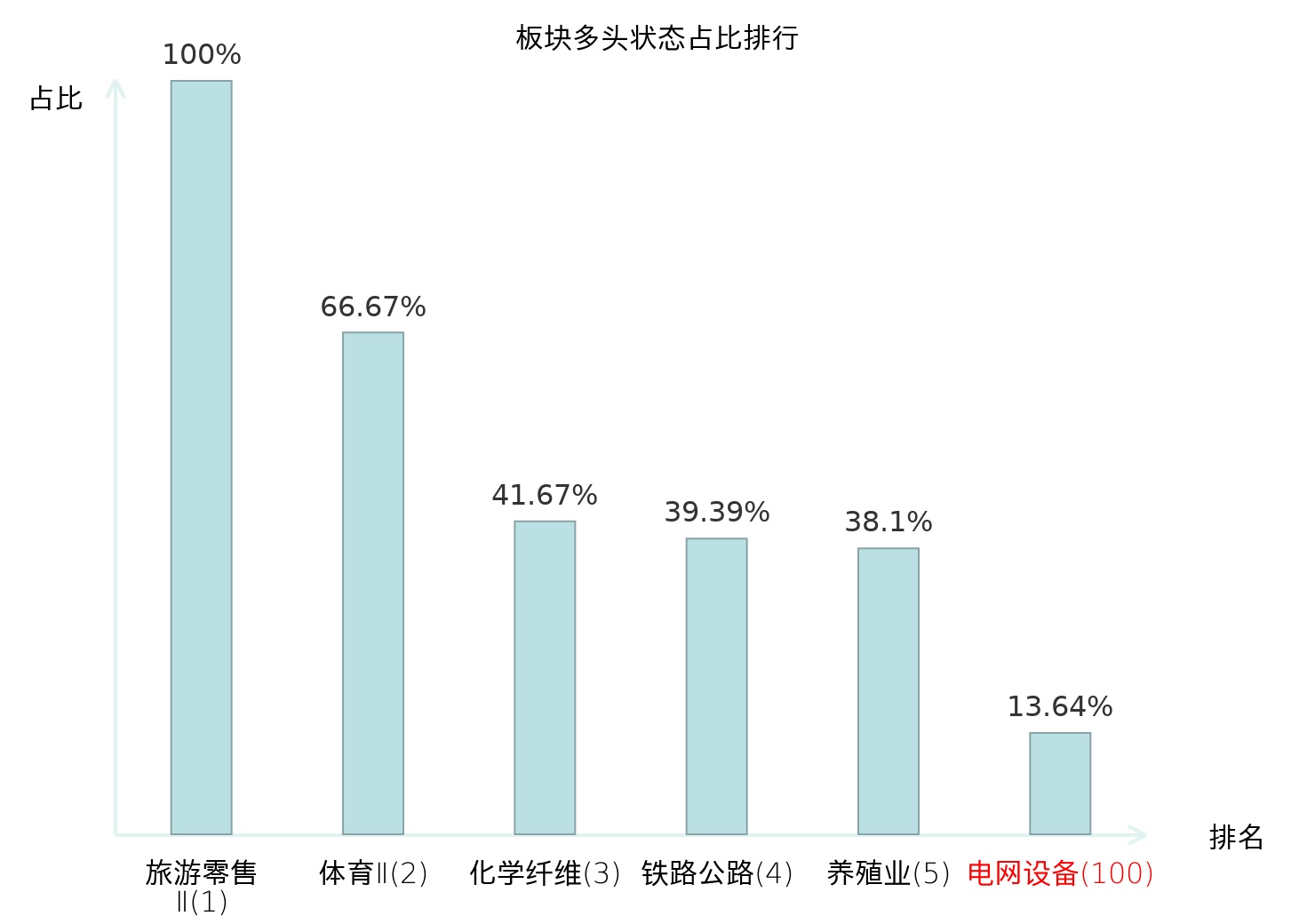 全市场所有行业板块中主力多头状态占比排名中,旅游零售Ⅱ板块位居第一。旅游零售Ⅱ板块名次提升最快,较昨日上升130位。