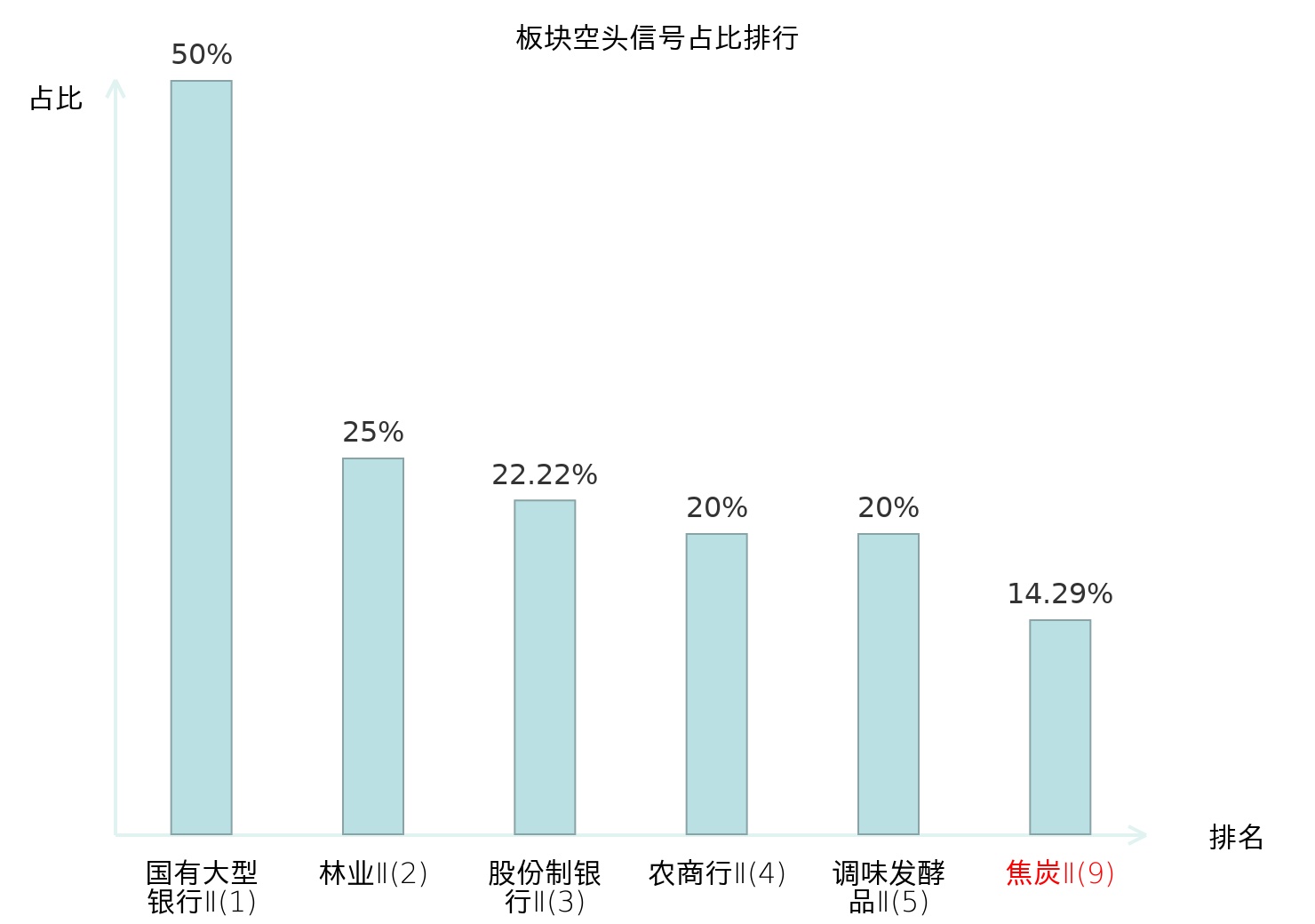 全市场所有行业板块中主力空头信号占比排名中,国有大型银行Ⅱ板块位居第一。电子化学品Ⅱ板块名次提升最快,较昨日上升111位。