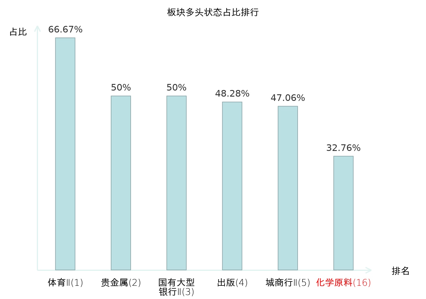 全市场所有行业板块中主力多头状态占比排名中,体育Ⅱ板块位居第一。电子化学品Ⅱ板块名次提升最快,较昨日上升78位。