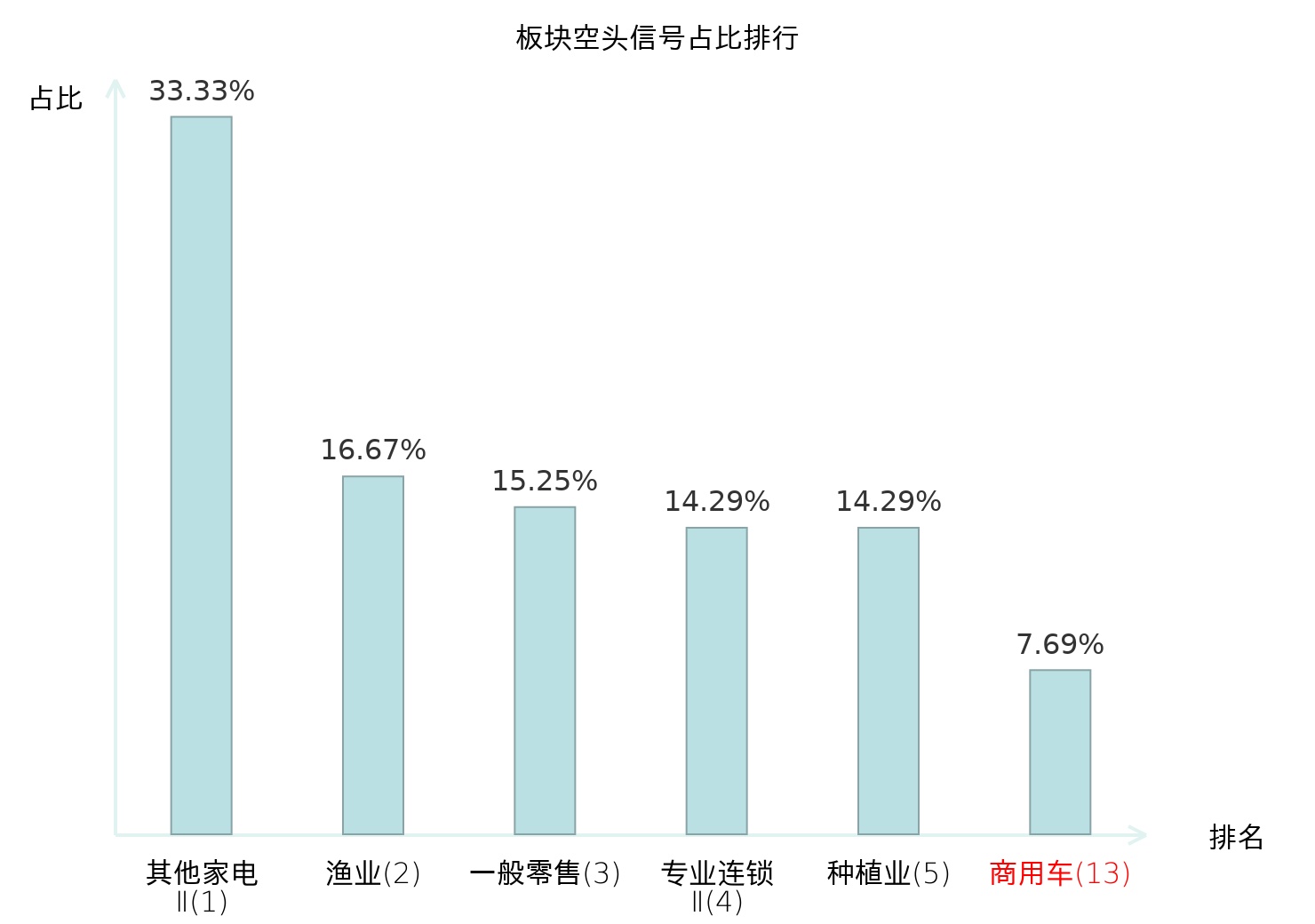 全市场所有行业板块中主力空头信号占比排名中,其他家电Ⅱ板块位居第一。造纸板块名次提升最快,较昨日上升115位。