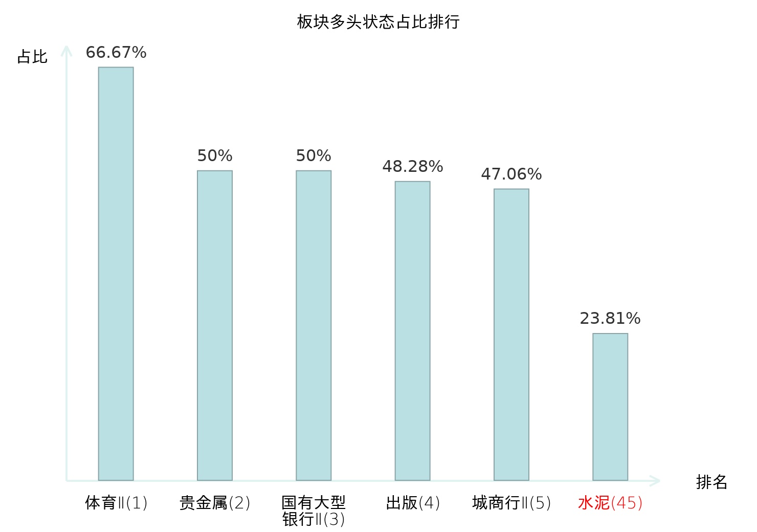 全市场所有行业板块中主力多头状态占比排名中,体育Ⅱ板块位居第一。电子化学品Ⅱ板块名次提升最快,较昨日上升78位。