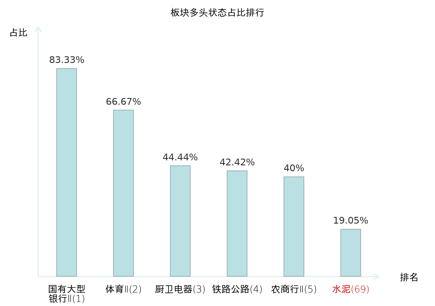 全市场所有行业板块中主力多头状态占比排名中,国有大型银行Ⅱ板块位居第一。包装印刷板块名次提升最快,较昨日上升30位。