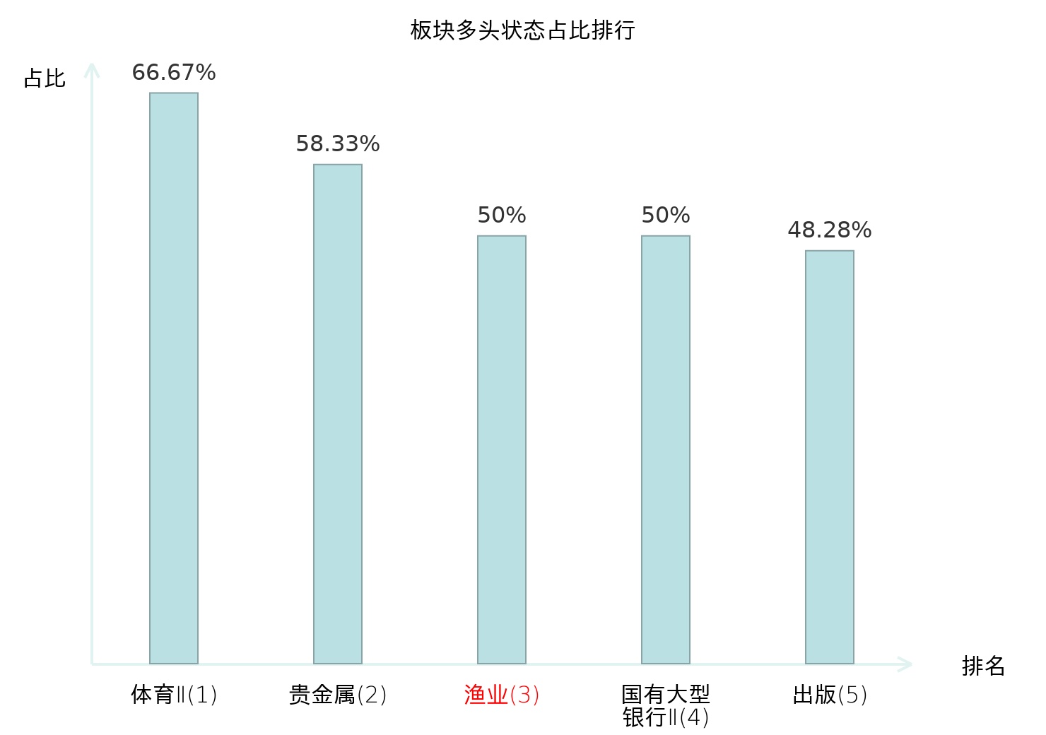 全市场所有行业板块中主力多头状态占比排名中,体育Ⅱ板块位居第一。医药商业板块名次提升最快,较昨日上升69位。