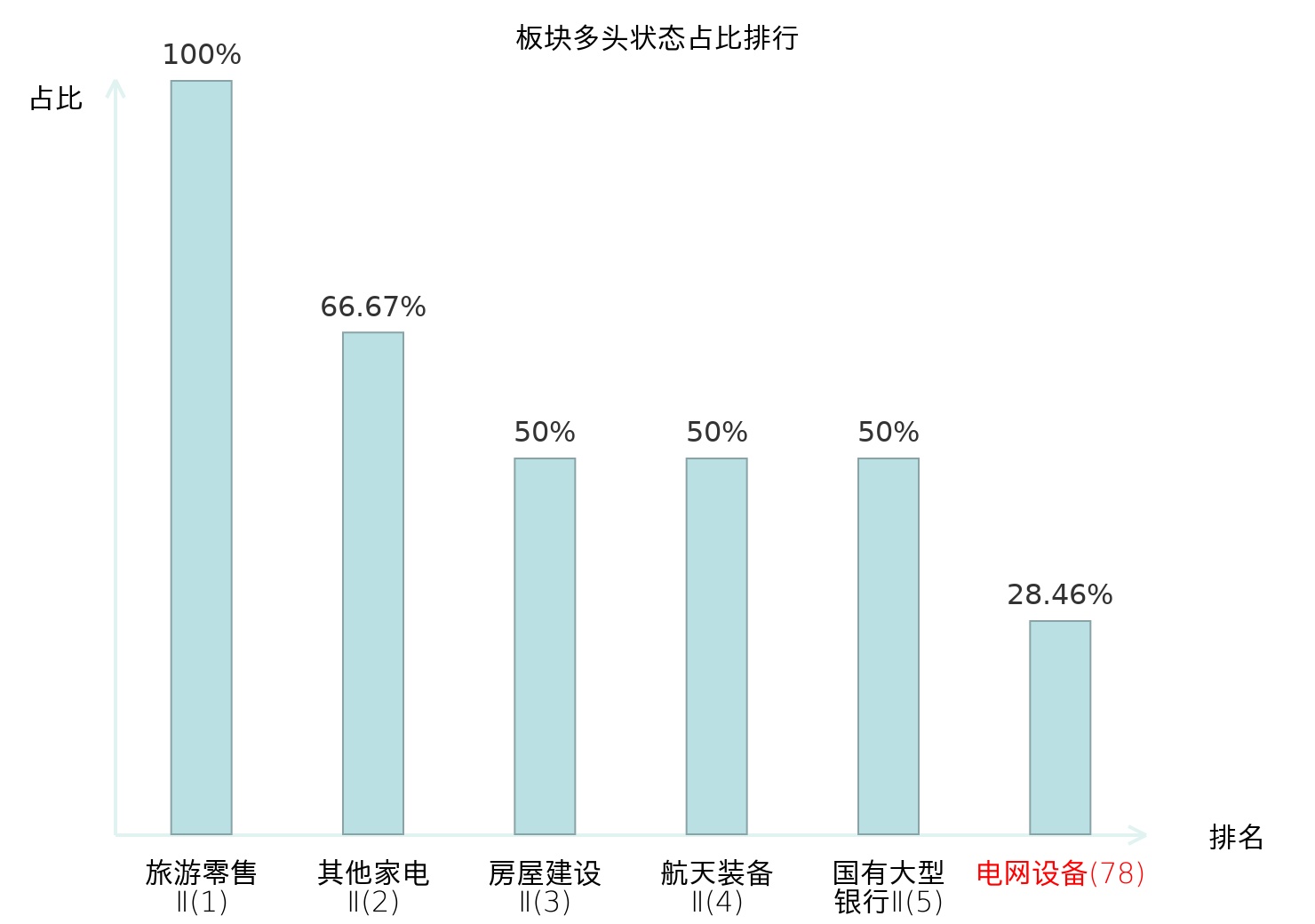 全市场所有行业板块中主力多头状态占比排名中,旅游零售Ⅱ板块位居第一。国有大型银行Ⅱ板块名次提升最快,较昨日上升112位。