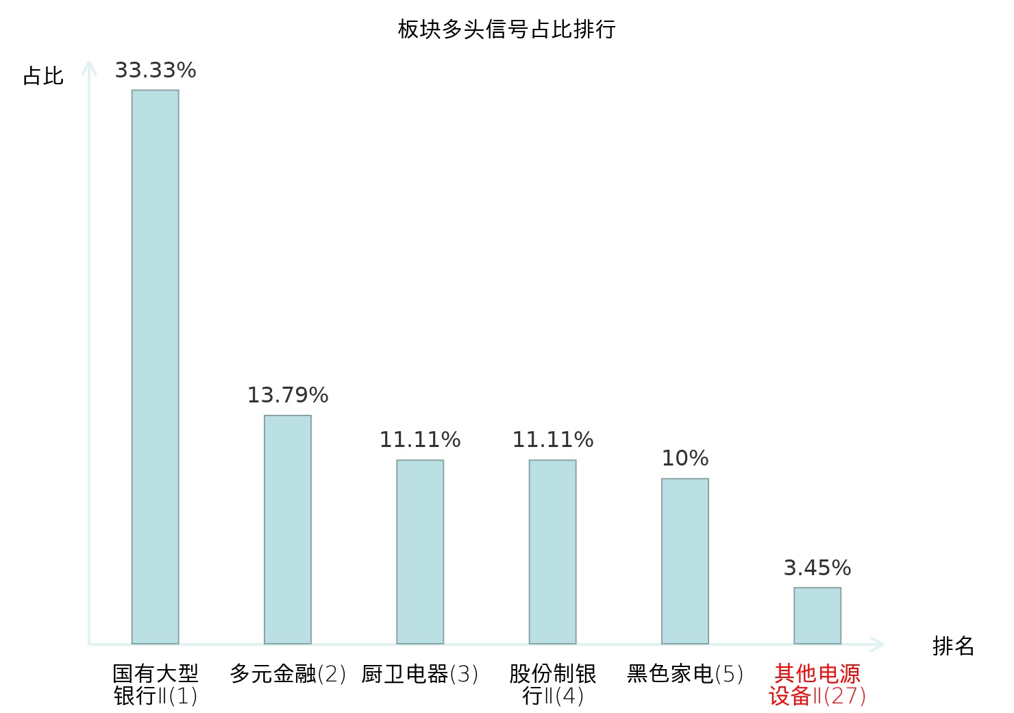 全市场所有行业板块中主力多头信号占比排名中,国有大型银行Ⅱ板块位居第一。股份制银行Ⅱ板块名次提升最快,较昨日上升115位。