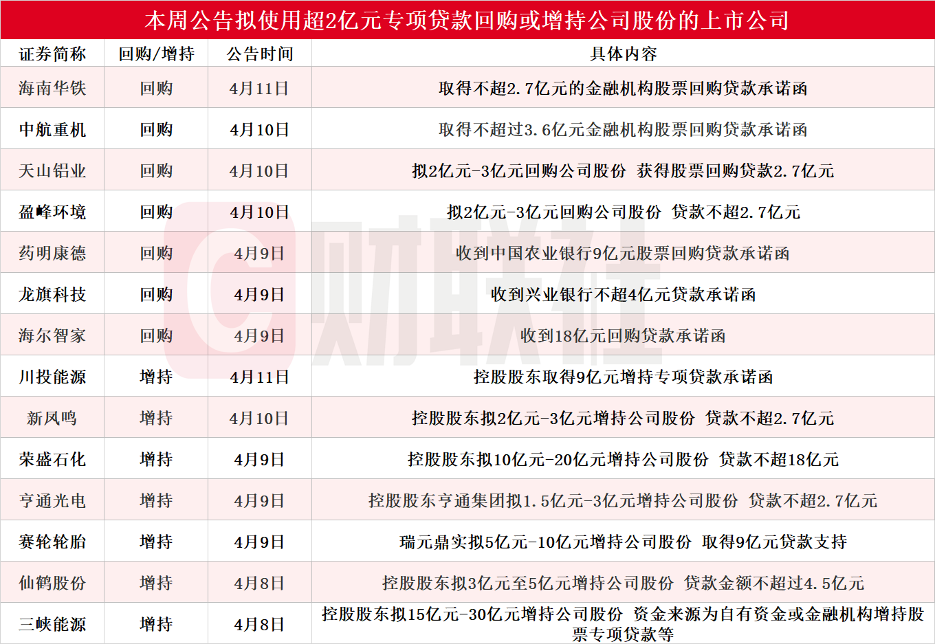 近期A股市场掀起新一轮增持回购潮,其中不乏公司披露回购增持再贷款相关情况。据财联社不完全统计,截至发稿,本周(4月7日-4月13日)包括海南华铁中航重机天山铝业盈峰环境药明康德龙旗科技海尔智家川投能源新凤鸣荣盛石化亨通光电赛轮轮胎仙鹤股份三峡能源在内的14家上市公司披露拟使用超2亿元专项贷款回购或增持公司股份。具体情况如下图: