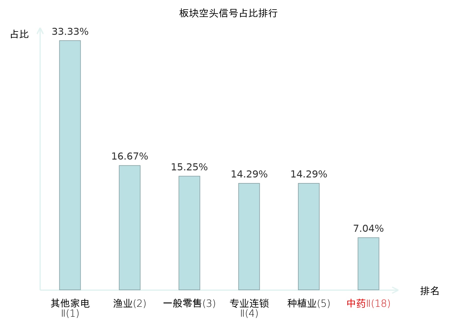 全市场所有行业板块中主力空头信号占比排名中,其他家电Ⅱ板块位居第一。造纸板块名次提升最快,较昨日上升115位。