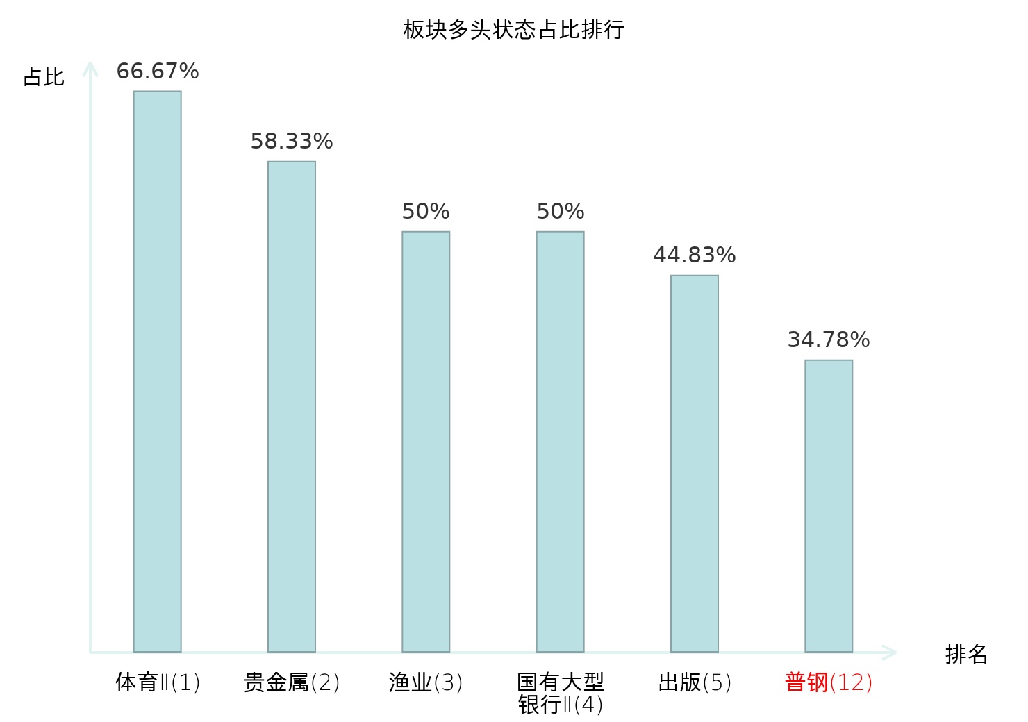全市场所有行业板块中主力多头状态占比排名中,体育Ⅱ板块位居第一。农业综合Ⅱ板块名次提升最快,较昨日上升113位。