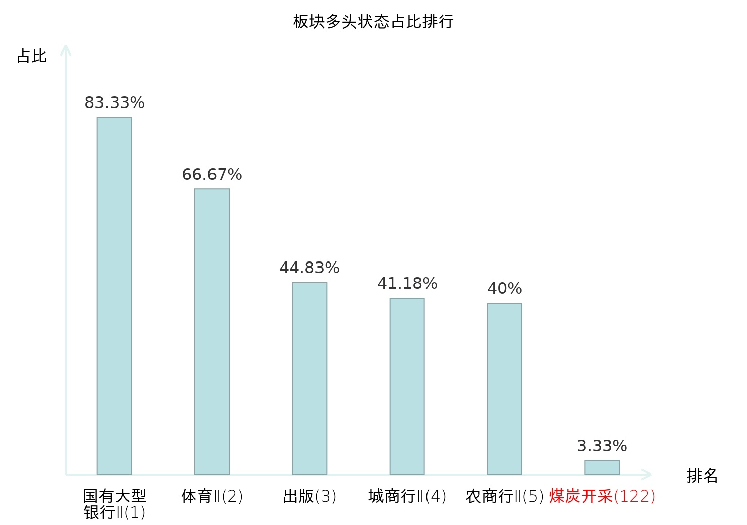 全市场所有行业板块中主力多头状态占比排名中,国有大型银行Ⅱ板块位居第一。焦炭Ⅱ板块名次提升最快,较昨日上升35位。