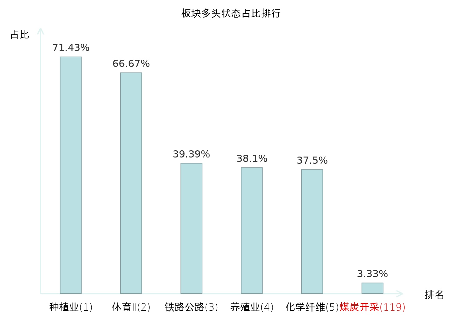 全市场所有行业板块中主力多头状态占比排名中,种植业板块位居第一。养殖业板块名次提升最快,较昨日上升99位。