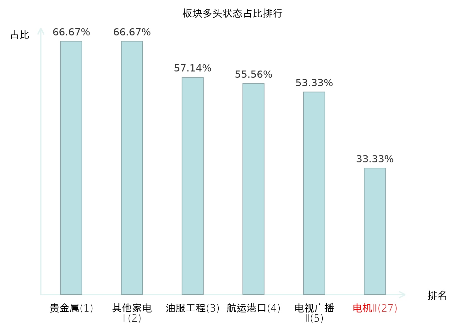 全市场所有行业板块中主力多头状态占比排名中,贵金属板块位居第一。医疗服务板块名次提升最快,较昨日上升68位。