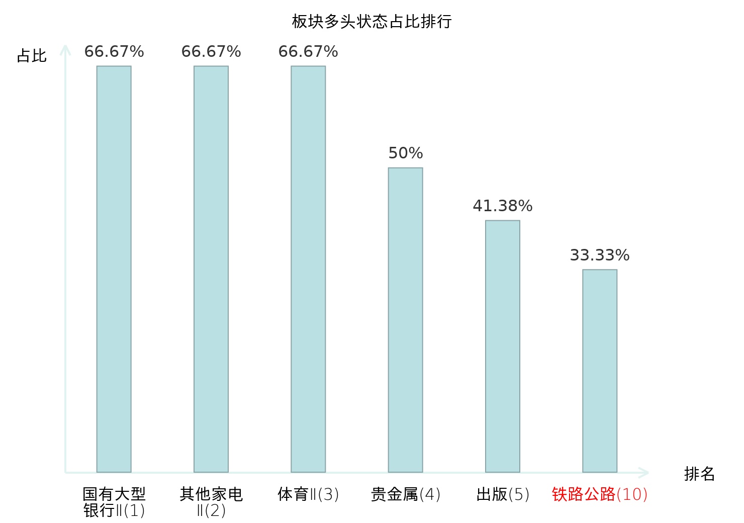 全市场所有行业板块中主力多头状态占比排名中,国有大型银行Ⅱ板块位居第一。林业Ⅱ板块名次提升最快,较昨日上升96位。
