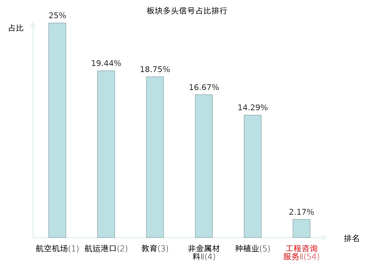 全市场所有行业板块中主力多头信号占比排名中,航空机场板块位居第一。航空机场板块名次提升最快,较昨日上升111位。