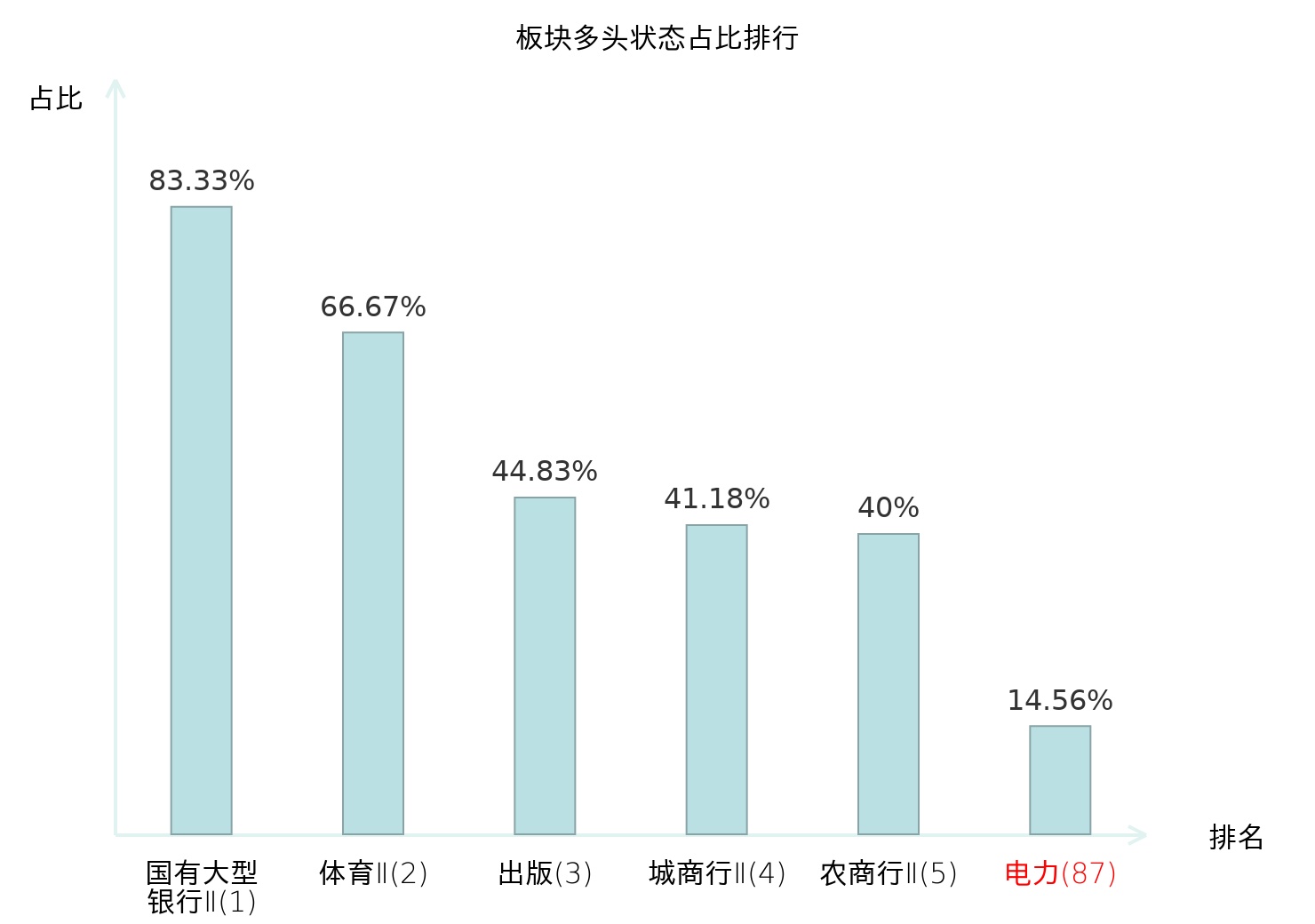 全市场所有行业板块中主力多头状态占比排名中,国有大型银行Ⅱ板块位居第一。焦炭Ⅱ板块名次提升最快,较昨日上升35位。