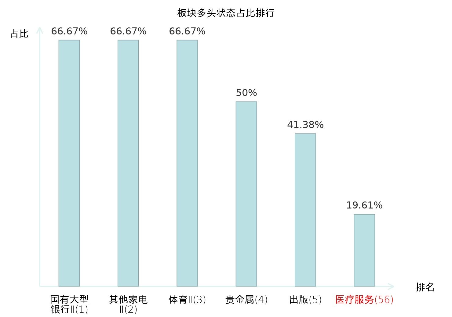 全市场所有行业板块中主力多头状态占比排名中,国有大型银行Ⅱ板块位居第一。林业Ⅱ板块名次提升最快,较昨日上升96位。