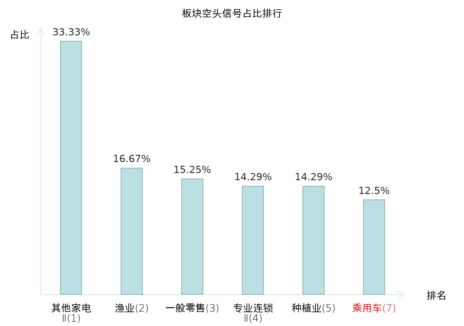 全市场所有行业板块中主力空头信号占比排名中,其他家电Ⅱ板块位居第一。造纸板块名次提升最快,较昨日上升115位。