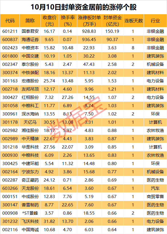 以封单金额计算,12股封单资金超1亿元,国泰君安、海通证券、中粮资本封单资金居前,分别为150.19亿元、90.37亿元、3.63亿元。
