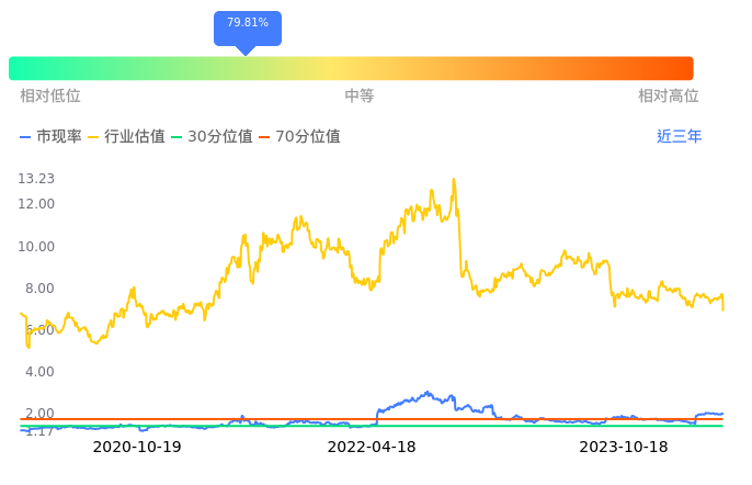 国电电力当前市净率PB为1.45,在所属的电力中,市净率PB排45,前五名分别为东旭蓝天市净率0.51、郴电国际市净率0.64、广州发展市净率0.82、晶科科技市净率0.85、湖北能源市净率0.88。国电电力当前市净率PB为1.39,超过近3年55.36%的历史数据。