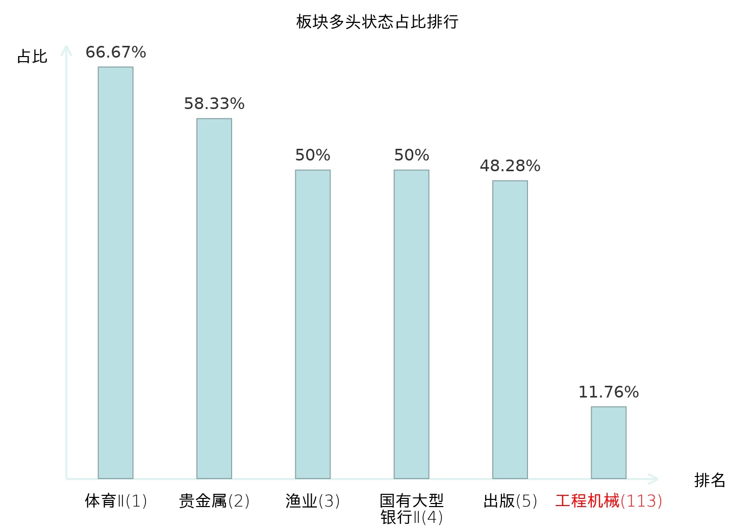 全市场所有行业板块中主力多头状态占比排名中,体育Ⅱ板块位居第一。医药商业板块名次提升最快,较昨日上升69位。