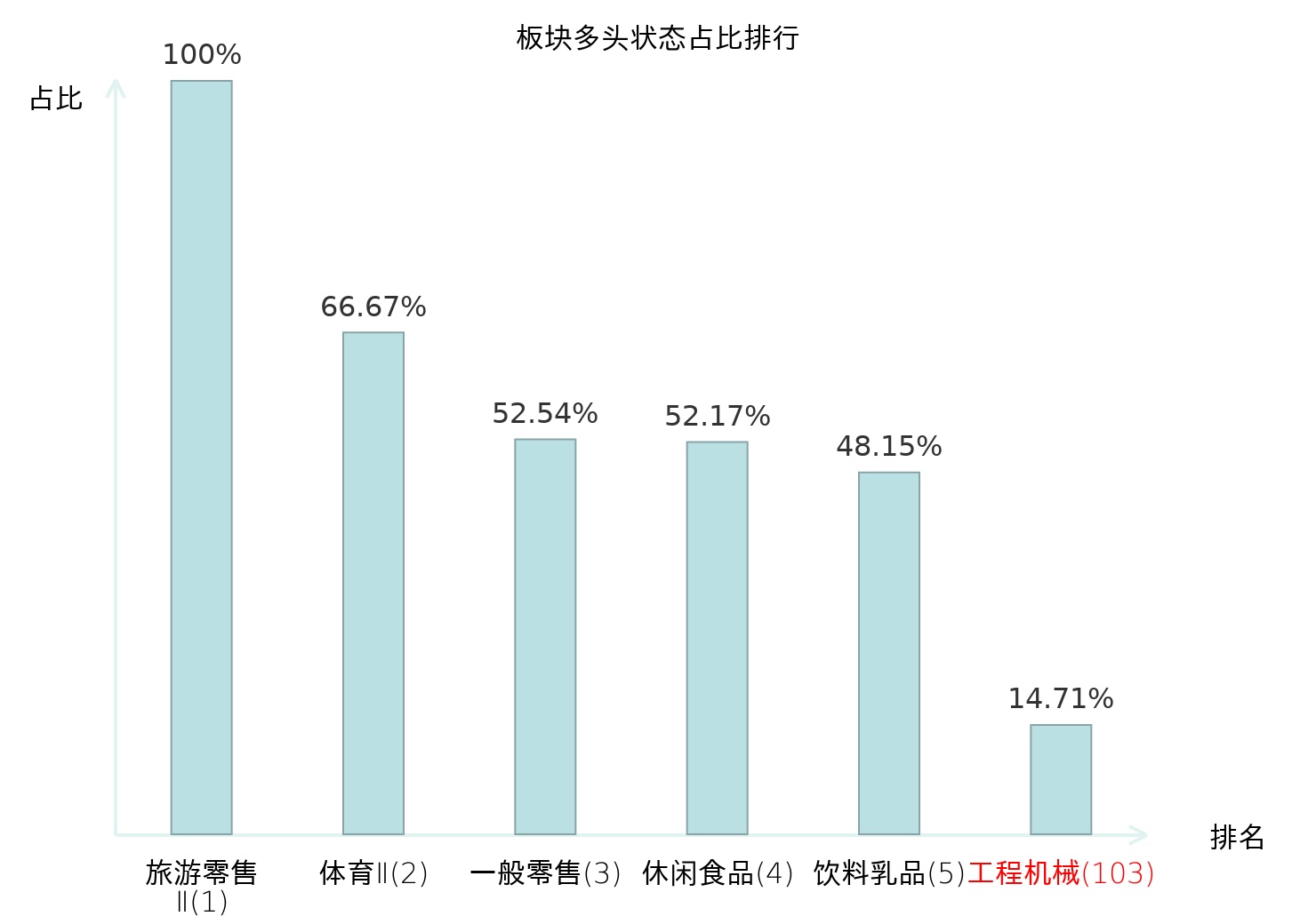 全市场所有行业板块中主力多头状态占比排名中,旅游零售Ⅱ板块位居第一。农业综合Ⅱ板块名次提升最快,较昨日上升109位。