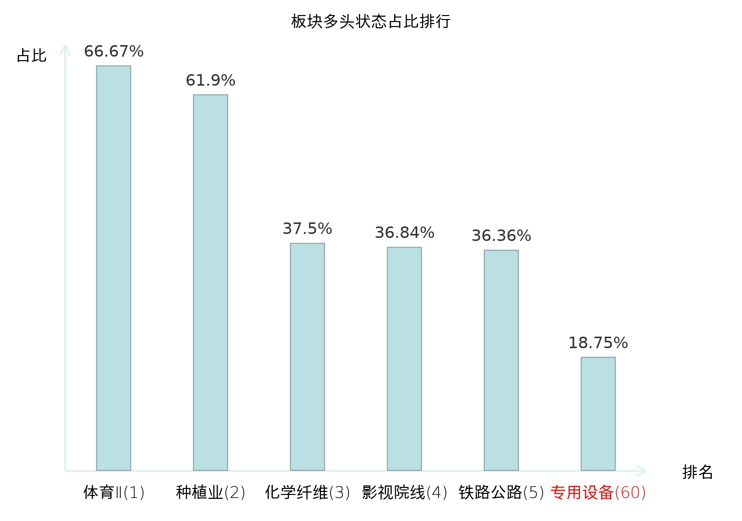 全市场所有行业板块中主力多头状态占比排名中,体育Ⅱ板块位居第一。种植业板块名次提升最快,较昨日上升65位。