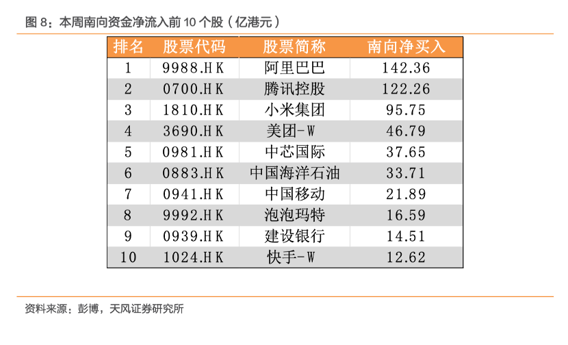(上周南向资金净流入前十个股,图片来源:天风证券)