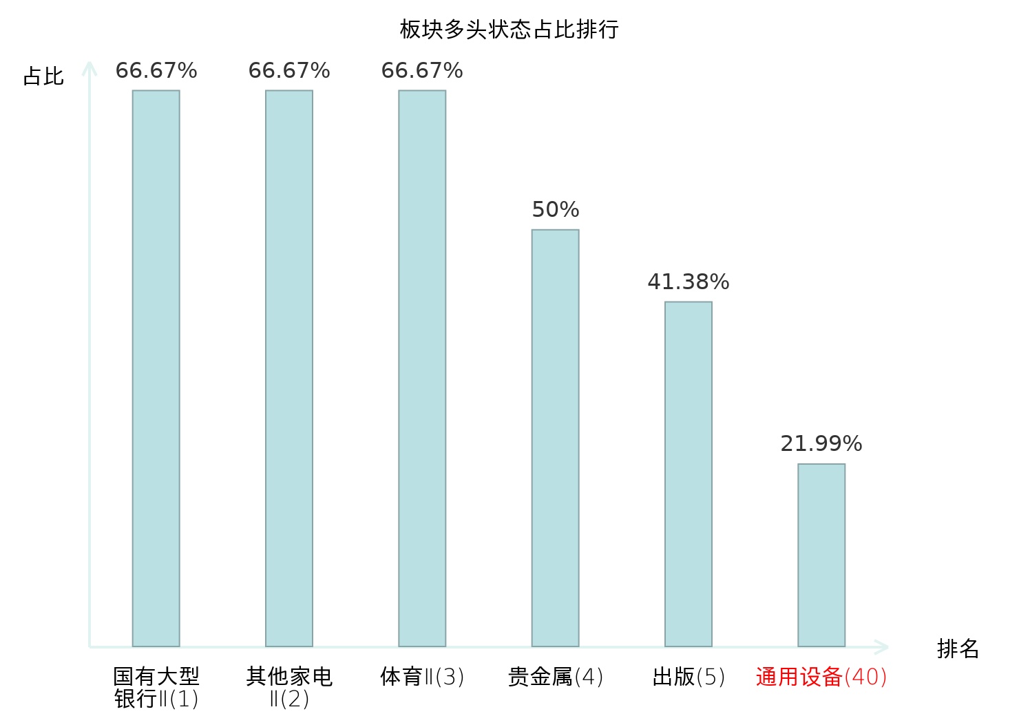 全市场所有行业板块中主力多头状态占比排名中,国有大型银行Ⅱ板块位居第一。林业Ⅱ板块名次提升最快,较昨日上升96位。