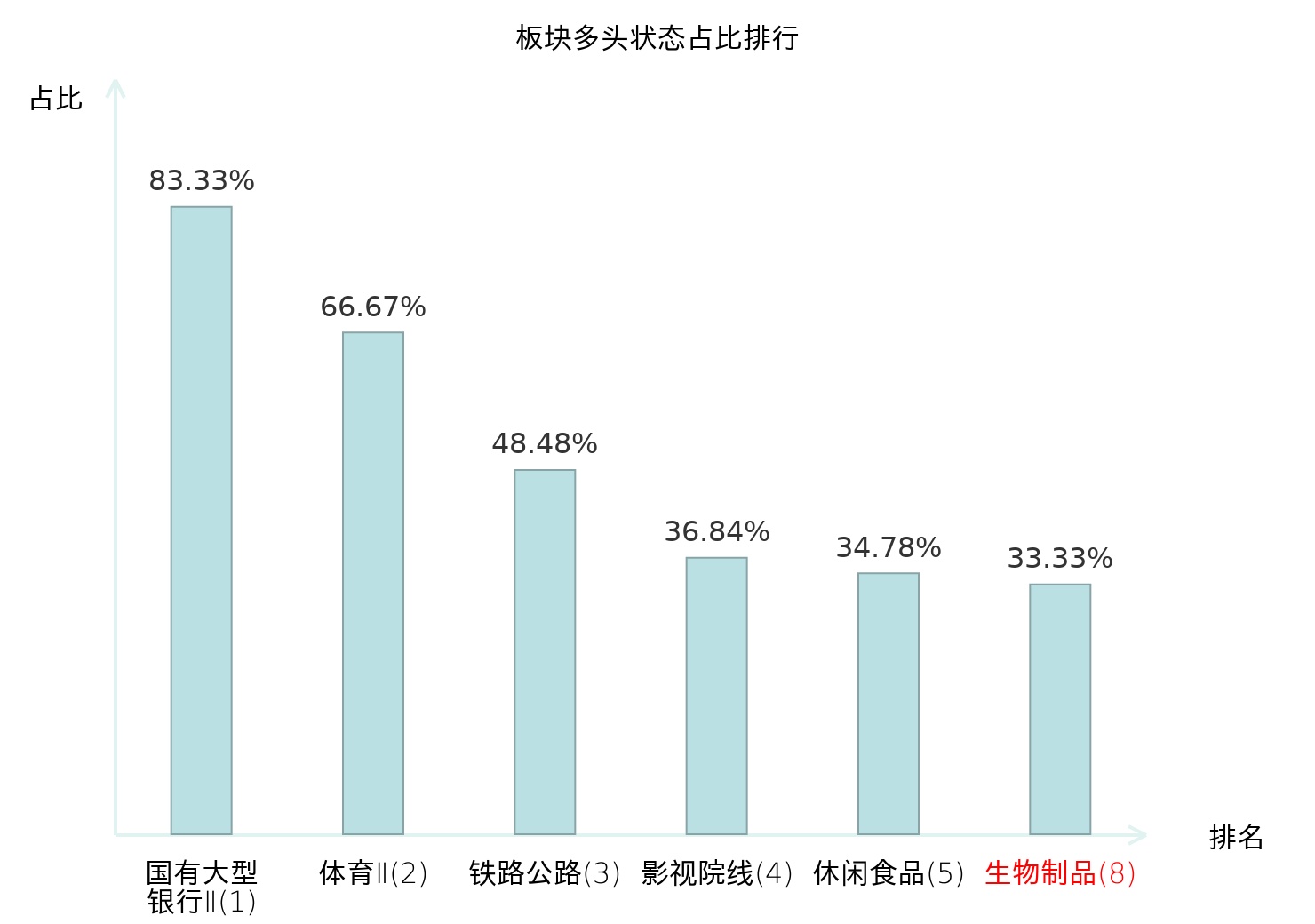 全市场所有行业板块中主力多头状态占比排名中,国有大型银行Ⅱ板块位居第一。个护用品板块名次提升最快,较昨日上升69位。