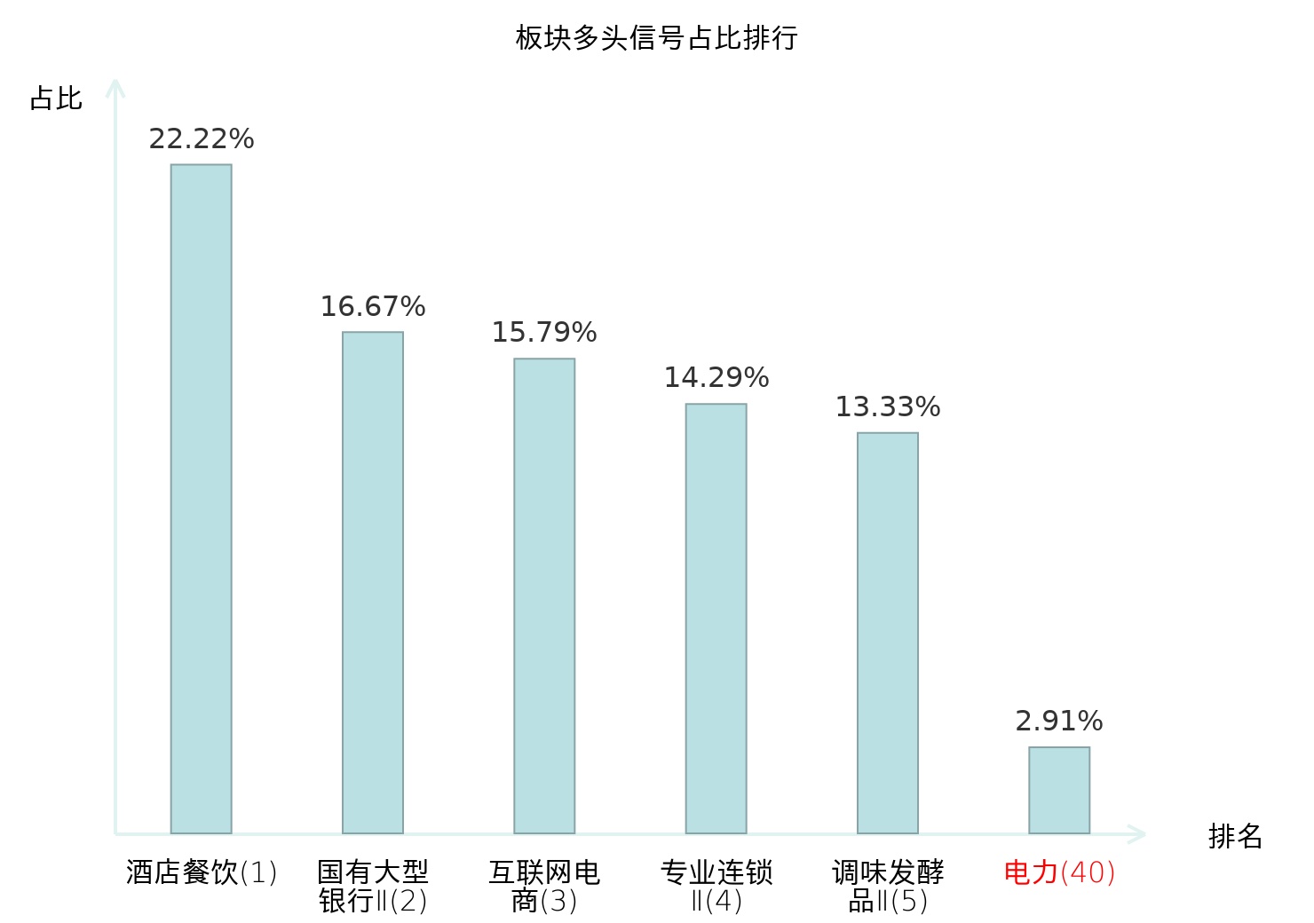 全市场所有行业板块中主力多头信号占比排名中,酒店餐饮板块位居第一。国有大型银行Ⅱ板块名次提升最快,较昨日上升121位。