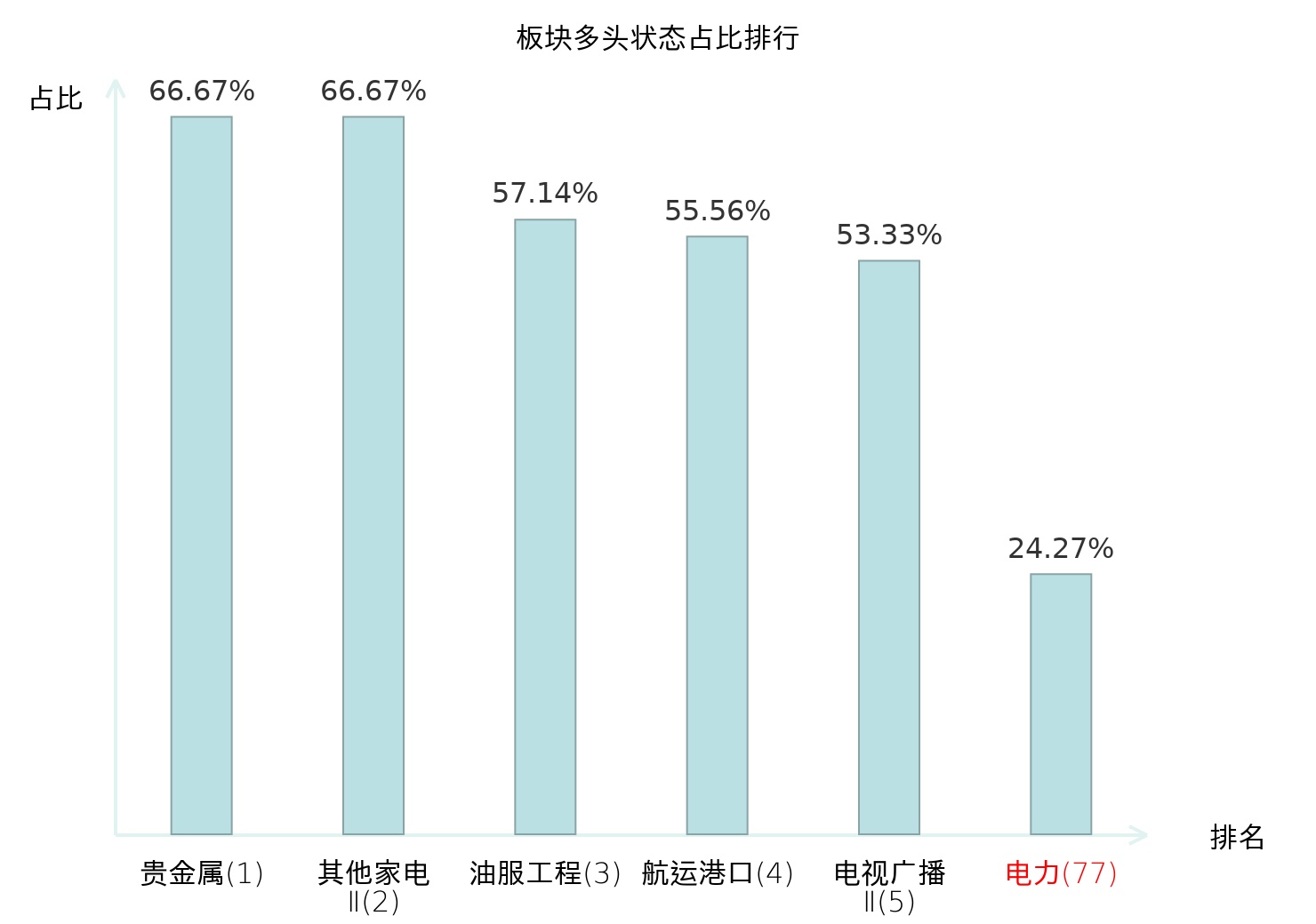 全市场所有行业板块中主力多头状态占比排名中,贵金属板块位居第一。医疗服务板块名次提升最快,较昨日上升68位。