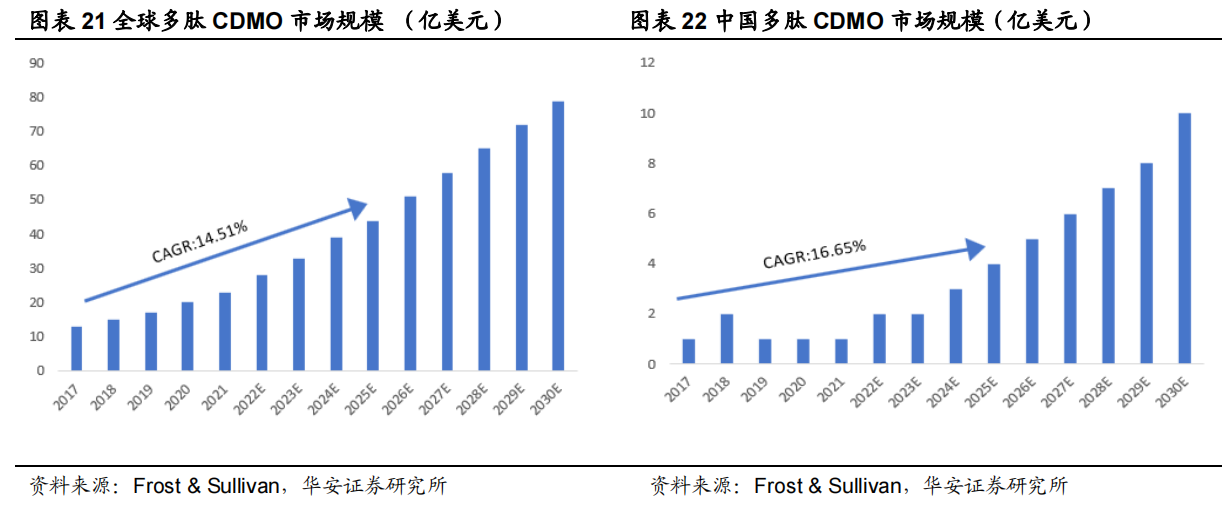 预计2025年全球市场规模将达到44亿美元。2017年至2025年的复合增长率为14.51%。此外,中国多肽CDMO市场也表现出了快速增长的态势。