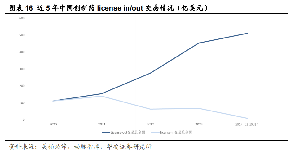 2024年中国创新药企Licenseout交易金额与事件数再创新高。根据动脉网,2024年1-10月Licenseout交易首付款金额约31.6亿美元,交易总金额高达511亿美元,已然超过2023年全年Licenseout交易总金额。