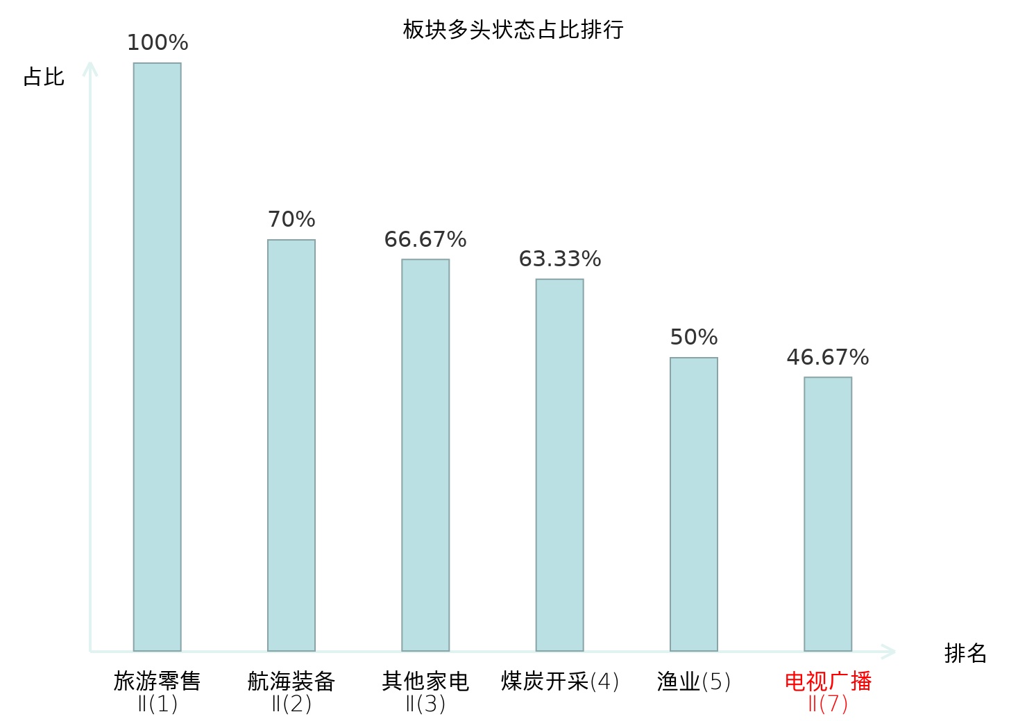 全市场所有行业板块中主力多头状态占比排名中,旅游零售Ⅱ板块位居第一。其他家电Ⅱ板块名次提升最快,较昨日上升127位。