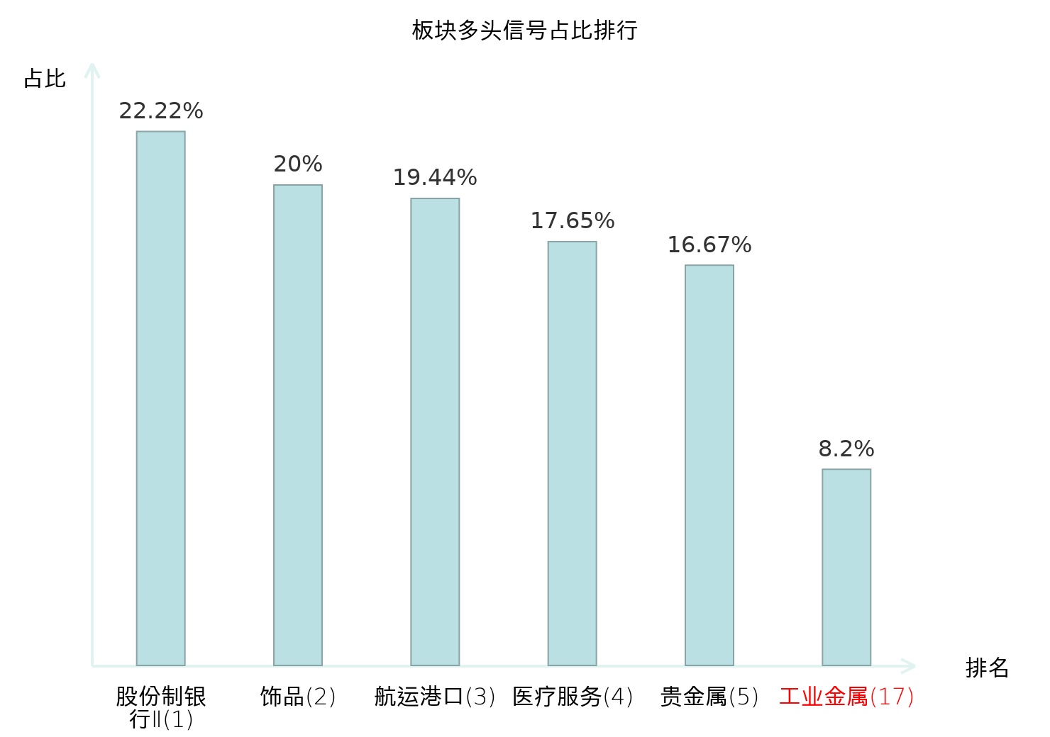 全市场所有行业板块中主力多头信号占比排名中,股份制银行Ⅱ板块位居第一。股份制银行Ⅱ板块名次提升最快,较昨日上升117位。