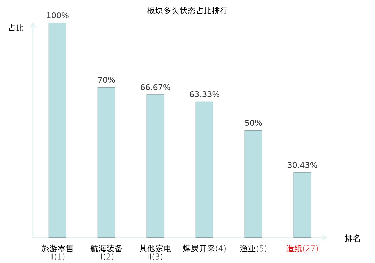 全市场所有行业板块中主力多头状态占比排名中,旅游零售Ⅱ板块位居第一。其他家电Ⅱ板块名次提升最快,较昨日上升127位。