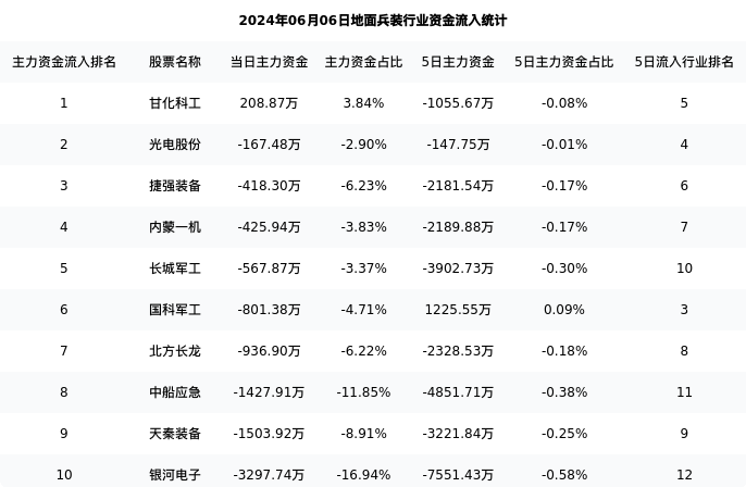 从主力资金流向来看,地面兵装行业今日主力资金流入9.63亿元,在所有申万二级行业中排名:100/131。