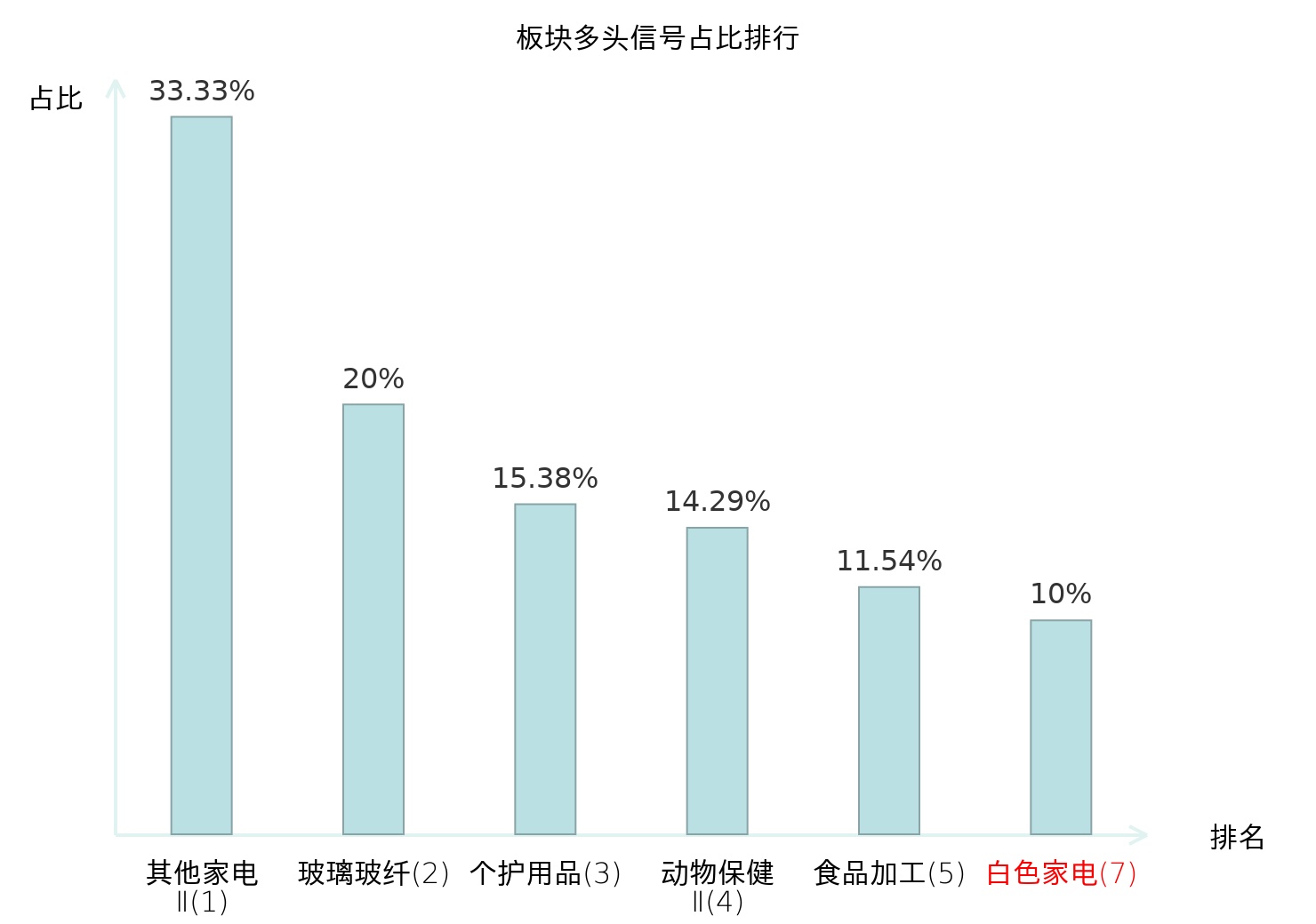 全市场所有行业板块中主力多头信号占比排名中,其他家电Ⅱ板块位居第一。其他家电Ⅱ板块名次提升最快,较昨日上升128位。