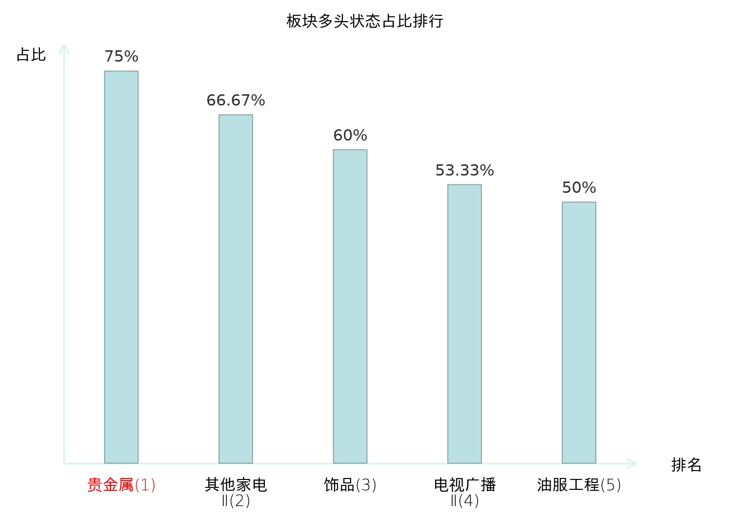 全市场所有行业板块中主力多头状态占比排名中,贵金属板块位居第一。农商行Ⅱ板块名次提升最快,较昨日上升106位。