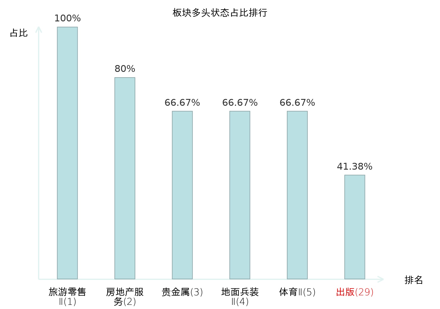 全市场所有行业板块中主力多头状态占比排名中,旅游零售Ⅱ板块位居第一。个护用品板块名次提升最快,较昨日上升70位。