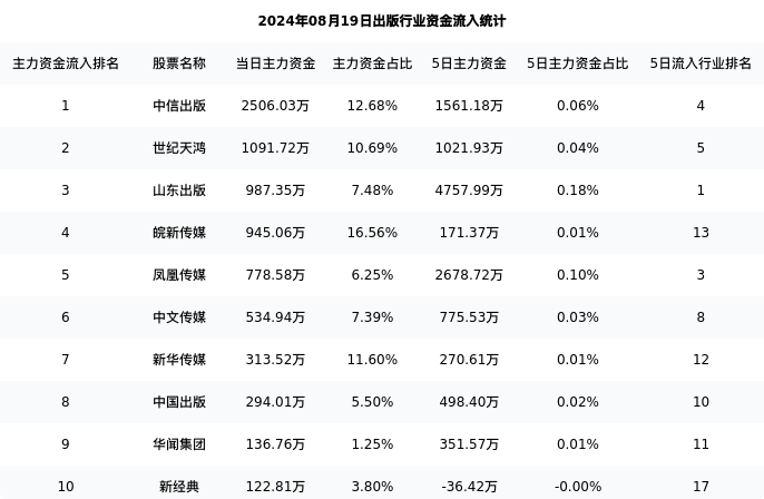 山东出版今日净流入987.35万,主力占比7.48%,在行业内排名:3/29;5日净流入4757.99万,主力占比0.18%,在行业内排名:1/29。
