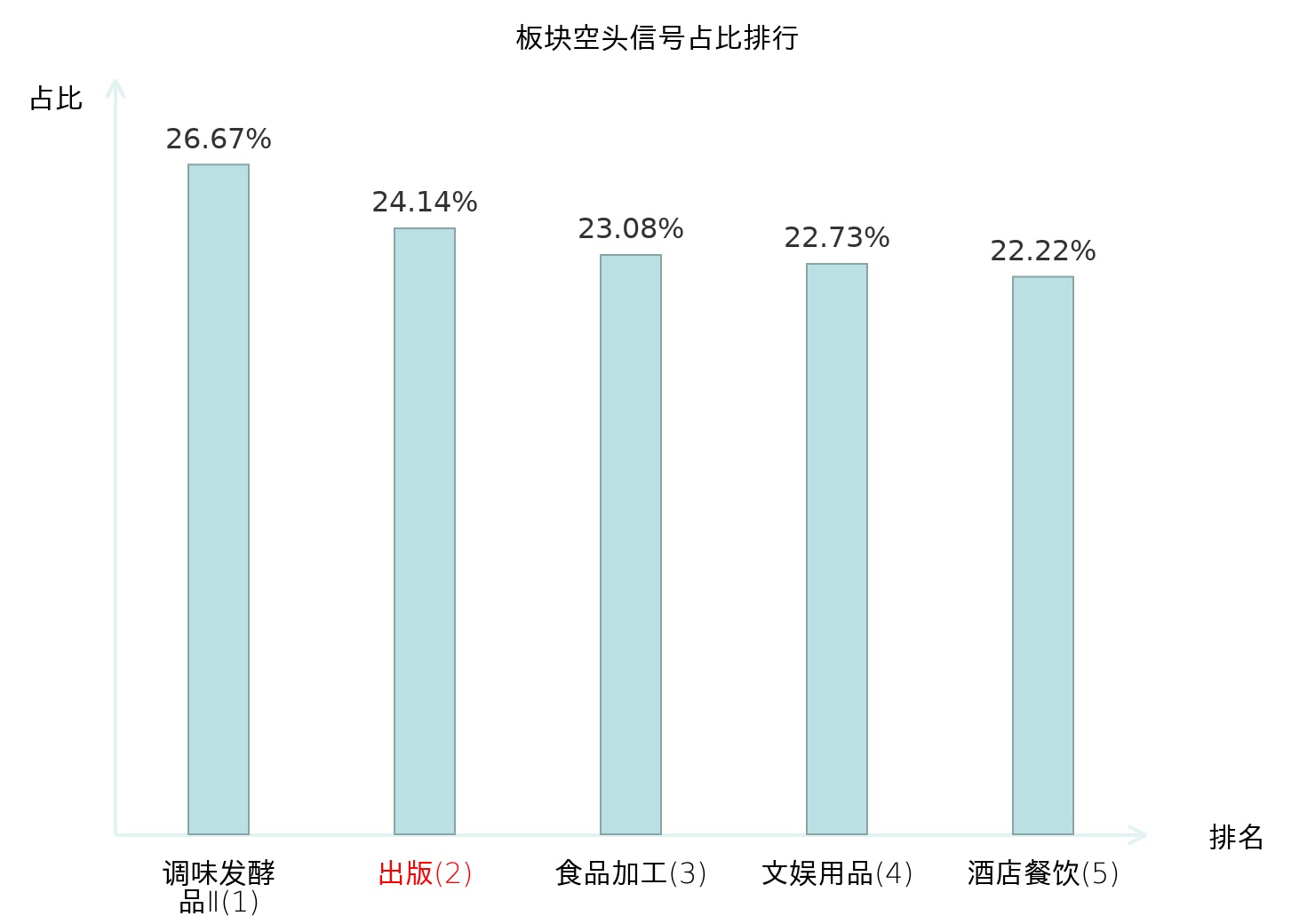 全市场所有行业板块中主力空头信号占比排名中,调味发酵品Ⅱ板块位居第一。中药Ⅱ板块名次提升最快,较昨日上升110位。
