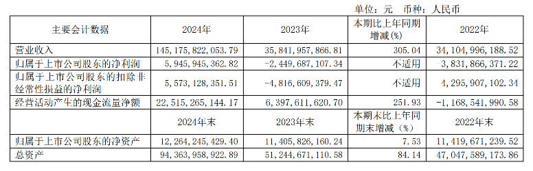 根据2024年年报,公司实现营业收入1451.76亿元,同比增长305.04%;实现归母净利润59.46亿元,同比实现扭亏为盈,上年同期为亏损24.5亿元。新能源汽车销量42.69万辆,同比增长182.84%。