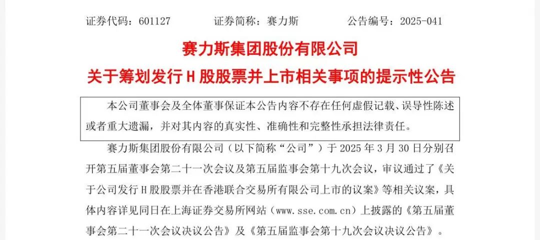 此外,赛力斯还发布《关于筹划发行H股股票并上市相关事项的提示性公告》。公司表示,为深入推进全球化战略布局,打造国际化资本运作平台,提高综合竞争力,拟发行境外上市外资股股票并在香港联交所主板挂牌上市。公司将在股东大会决议有效期内选择适当的时机和发行窗口完成本次发行并上市。