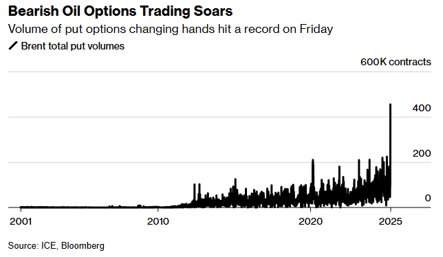 从近来市场的成交情况来看,自上周特朗普对等关税计划宣布后的这轮油价暴跌,其放量程度无疑堪称是史诗级的——洲际交易所 (ICE)的布伦特原油期货和期权合约成交量在上周五创下了历史新高,甚至超过了新冠疫情期间的水平。