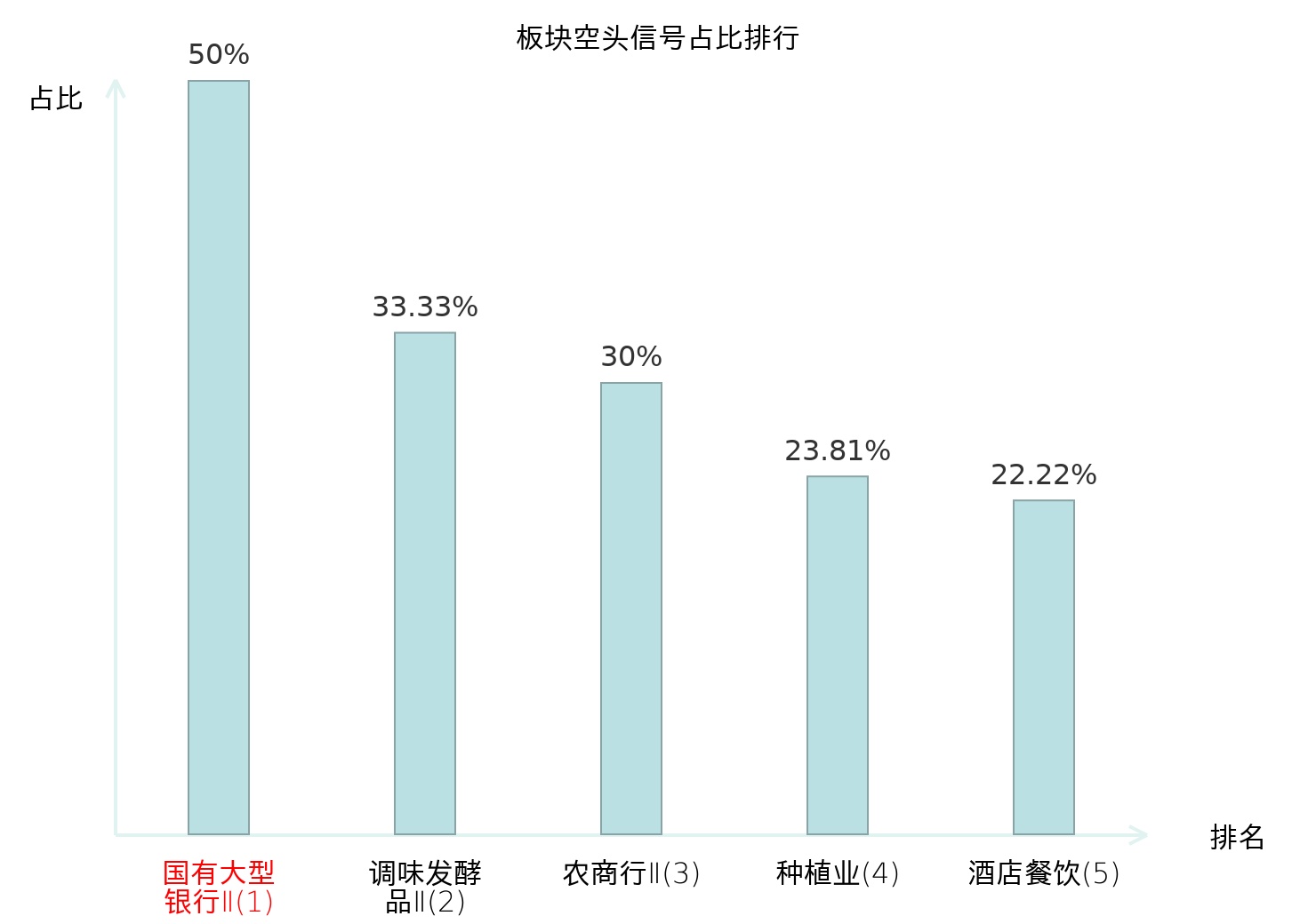 全市场所有行业板块中主力空头信号占比排名中,国有大型银行Ⅱ板块位居第一。半导体板块名次提升最快,较昨日上升94位。